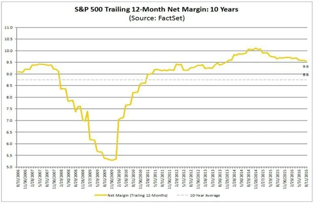 Oproti loňsku klesly zisky firem z indexu S&P 500 (poté, co své výsledky reportovalo 91 % společností) průměrně o 3,5 %, přičemž pokles z vrcholu činí již 10 %. A příjmy jsou na tom ještě hůře, když klesají již šesté čtvrtletí v řadě. A pokles se nevyhýbá ani maržím, které padají již od roku 2014 a nad průměrem se drží jen díky katastrofálním výsledkům z let 2008 až 2010. Vzhledem k síle dolaru, slabým cenám energií a poklesu produktivity práce se ani není čemu divit.