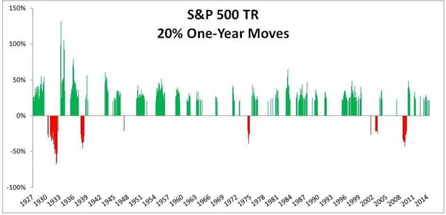 Z grafu je jasně patrné, že medvědích trendů bylo v minulosti na americkém akciovém trhu mnohem méně než těch býčích. Z 394 jednoletých pohybů o 20 % od roku 1926 bylo 336 pozitivních a pouze 58 negativních. Vyplývá z toho, že akcie mají šestkrát větší pravděpodobnost, že za rok o 20 % zhodnotí, než že 20 % hodnoty ztratí.