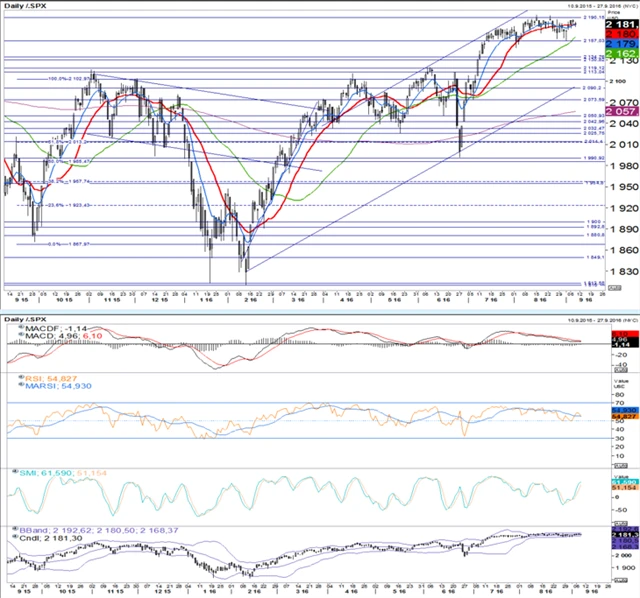 Index se pátečním poklesem o více než 2 % propadl na úroveň loňských historických maxim, tedy na často zmiňovanou hladinu podpory. Uzavíral ale na denním minimu, a tak nelze mluvit o tom, že by se na této úrovni zastavil. Poklesy mohou pokračovat, další podpora může být na psychologicky zajímavé hladině 2 100, kde zhruba leží i linie letošního růstového trendu. "Brexitové" minimum je ještě o 100 bodů níže. Návrat nad 2 150 by byl naopak pozitivním signálem, cena by se jím přiblížila úzkému obchodnímu pásmu z letošního léta. Jako silná rezistence ale může stát v cestě 50denní klouzavý průměr (aktuálně 2 163), pod který index bez zaváhání spadl během pátku.