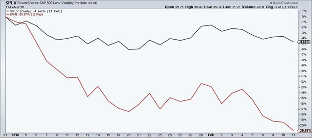 Na prvním grafu vidíme srovnání výkonnosti fondu zaměřeného na takzvané high beta tituly (větší volatilita než trh, v tomto případě index S&P 500) a fondu, který investuje do málo volatilních titulů, od začátku letošního roku do poloviny února. High beta zažily špatný začátek roku (-21 % za prvních 28 obchodních dní) oproti titulům s podprůměrnou volatilitou (-5 %).
