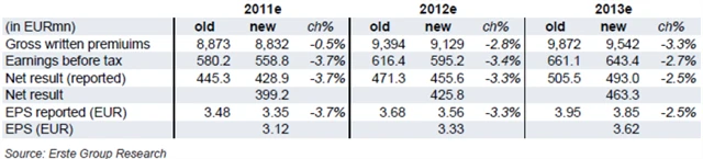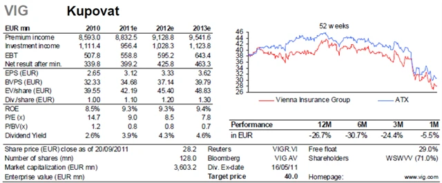 Toto číslo však nezahrnuje úrok za hybridní kapitál. Protože VIG začala zveřejňovat zisk na akcii upravený o úroky hybridního kapitálu, změnili jsme svou definici zisku na akcii u VIG. Do budoucna budeme rovnou počítat s upravenou verzí zisku na akcii. Naše nové odhady zisku na akcii (tedy již upravené o úroky za hybridní kapitál) nyní dosahují 3,12 EUR, 3,33 EUR a 3,62 EUR (odhady pro roky 2011-2013). Novou cílovou cenu 40 EUR za akcii jsme odvodili ze spíše konzervativních předpokladů. Proto potvrzujeme doporučení akcie VIG kupovat.