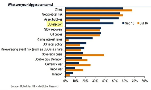 Čína, geopolitická rizika a spekulativní bubliny na trzích jsou pro investory oslovené Bank of America Merrill Lynch největší aktuální rizika. (Nejen) pro americké hráče jsou stále větším strašákem i prezidentské volby v USA, konkrétně stále velice otevřený souboj obou hlavních kandidátů. Z dalších zaujme výrazný nárůst obav ze zvyšování sazeb.