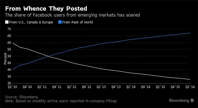 Demografii neporazíte, tedy ne tak rychle, aby vás to zajímalo jako investory. Stále větší podíl uživatelů Facebooku je z rozvíjejících se ekonomik. Pro obří mediální (i když jí nechce být) a reklamní společnost, která nám všem umožňuje sdílet a sledovat ty nejméně podstatné věci na světě, ale i zlomové události, a umí na tom stále lépe vydělávat, znamenají mladé trhy obrovský potenciál. Všechno se může pokazit, ale akcie Facebooku i v blízkosti svých historických maxim stále nemusejí ve vašem portfoliu působit vyčerpaně.
