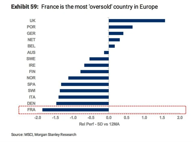 Na téma se lze podívat mnoha způsoby, podle Morgan Stanley jsou ale aktuálně nejvíce podhodnocené cenné papíry ve Francii, naopak zbytečně "na kopci" je Británie. Je důležité zmínit, že jde o relativní hodnocení vůči vlastnímu ročnímu průměru.