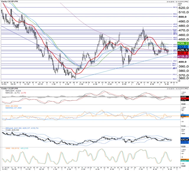 Technická analýza cen akcií ČEZ a Komerční banky. (21. 9. 2016)