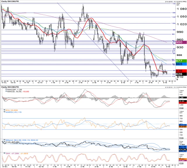 Cena akcií Komerční banky je v současnosti mírně pod 20denním průměrem a hluboko pod dlouhodobějšími průměry. MACD histogram je kladný, dále však ztrácí momentum a blíží se nule. RSI se dále propadl na 40 bodů a klesá. Cena se odrazila od horní hranice Bollingerova pásma a nachází se v jeho středu. Akciím chybí technické růstové impulzy, očekáváme spíše stagnaci až protirůstové tendence. Dobře otestovaná podpora se nachází na 818 Kč.