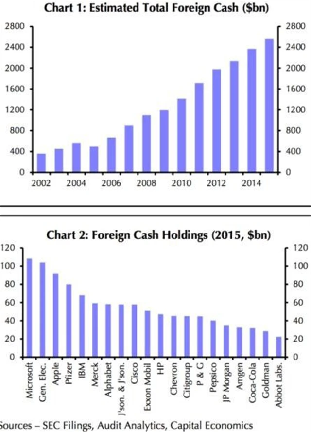 Takže jak je to s tou hotovostí amerických firem na účtech v zahraničí? Loni se tato částka vyšplhala na rekordních 2,5 bilionu USD, což je zhruba sedmina ročního výkonu americké ekonomiky a dost přesně velikost té francouzské.