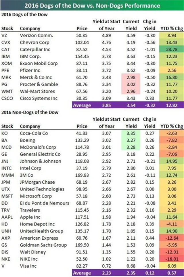 Jen pro zajímavost, růžově jsou mezi deseti sledovanými akciemi vyznačeny výnosy těch, které by vypadly ze seznamu "Dogs of the Dow", pokud by nyní začínal nový kalendářní rok a na základě zmíněné strategie by se sestavovalo nové "portfolio" deseti akcií. Mezi dvaceti zbývajícími tituly jsou naopak zeleně vyznačeny výnosy akcií, které by byly nováčky v seznamu "psů".