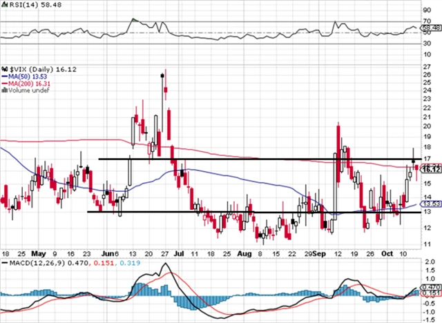 Index volatility VIX se z bezstarostných hodnot přesunul k horní hladině dlouhodobého rozpětí. Za týden přidal 20 % a je na úrovni, kdy investoři začínají být obezřetní. Hodnoty okolo 17-18 ovšem považuji z dlouhodobějšího hlediska za správné.