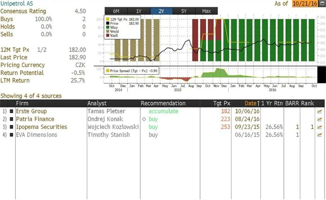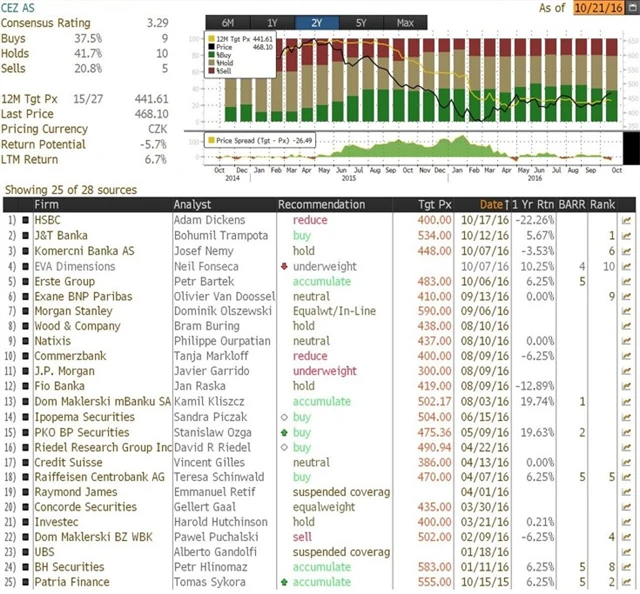 Jaký názor mají na akcie ČEZ a Unipetrolu domácí a zahraniční analytici? Jaké jsou jejich dvanáctiměsíční cílové ceny a jak znějí jejich aktuální investiční doporučení? Nabízíme jejich přehled, jak jej k 21. 10. 2016 shromáždila agentura Bloomberg. (23. 10. 2016)