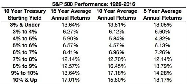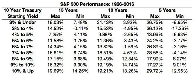 V současnosti, kdy jsou sazby na bezprecedentních minimech, bude zajímavé sledovat, zda to povede také k podprůměrným výnosům z držení akcií, což by bylo zdánlivě logické. Porovnejme historické výnosy akcií v různých obdobích s různými výchozími sazbami u 10letých státních dluhopisů.
