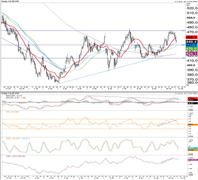 Komerční banka a ČEZ: České blue chips pohledem technické analýzy (3. 11. 2016)
