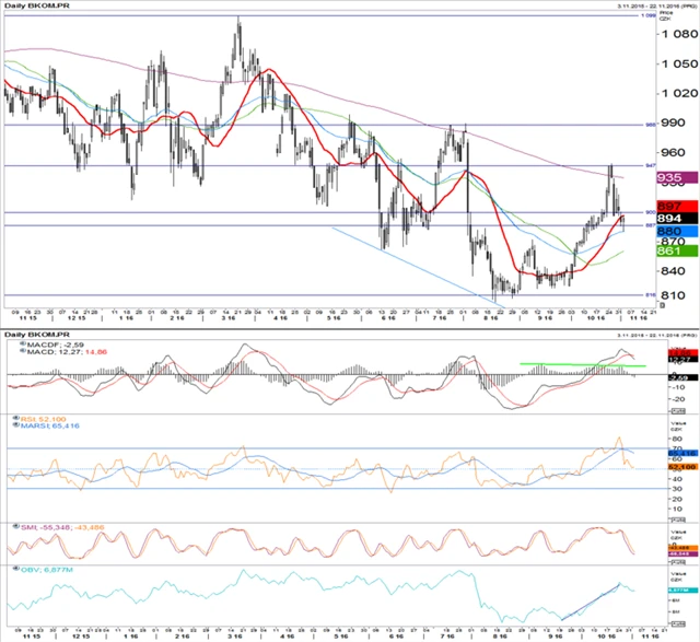 Akcie po delším pobytu v oblasti překoupenosti prudce oslabily. Podpora by mohla být nalezena na 887 Kč. MACD zahájila sestup a prorazila pod signální linii. Tato divergence je první za poslední 2 měsíce. RSI po svém prudkém poklesu nalezl podporu na 50bodové hranici, nyní jeví mírné známky zotavení. SMI indikuje zpomalení poklesu, ale k samotnému proražení ještě nedošlo. Akcie mají za sebou prudkou korekci. Pokračování klesajícího trendu signalizuje především MACD, která klesla pod signální linii prvně za poslední dva měsíce. Technické indikátory však tento týden nebudou hrát prim, ten na sebe vzaly hospodářské výsledky za třetí kvartál.