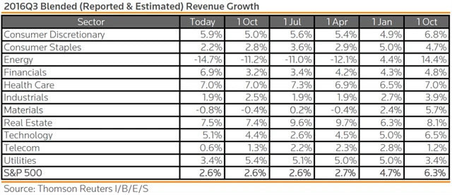 Jak se vyvíjejí odhady růstu či poklesu tržeb firem z S&P 500?