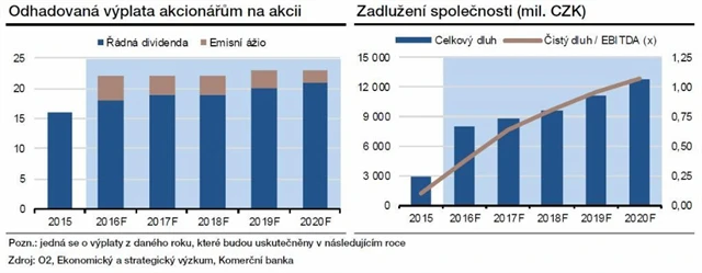 Komerční banka očekává, že díky programu zpětného odkupu akcií O2 poroste dividenda o něco rychleji než čistý zisk. Příští rok by podle Frayera měla společnost na jednu akcii vyplatit dividendu a část z emisního ážia v souhrnné výši 22 korun, což by znamenalo vyšší než 15% výnos. Z emisního ážia by měly být vyplaceny čtyři koruny na akcii, samotná dividenda by tak měla činit 18 korun na akcii. Zadlužení společnosti podle analytika v důsledku výplaty emisního ážia letos stoupne z 0,1násobku čistého dluhu k zisku EBITDA na 0,4násobek a do roku 2020 se zvýší na 1,1násobek. "To může být stále jen konzervativní odhad vzhledem k tomu, že O2 si svůj střednědobý cíl stanovila na 1,5násobek. Vezmeme-li v potaz dividendovou politiku a investiční aktivitu, zdá se nám být námi předpokládané zadlužení jako rozumné a dostačující, aby se firma nedostala do problémů s likviditou," míní Frayer.