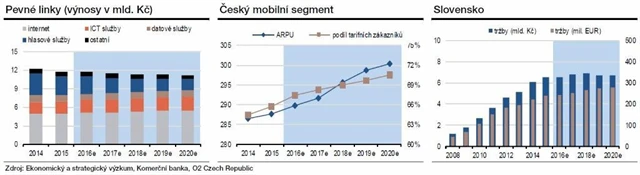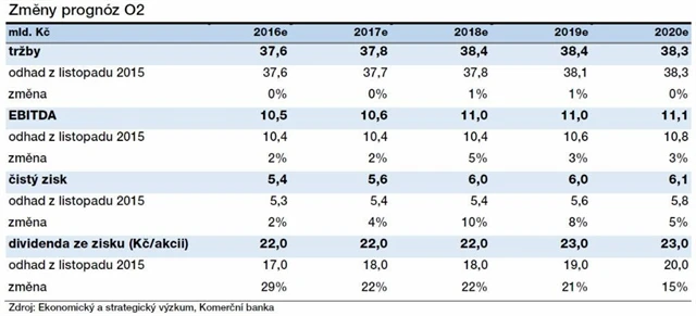 "Dlouhodobě očekáváme, že profitabilita O2 na úrovni provozního zisku EBITDA i čistého zisku poroste. Růst nicméně bude výrazně pomalejší. Růst tržeb by měl mezi roky 2016 a 2020 činit ročně v průměru 0,4 %. Zisk EBITDA by měl zaznamenat průměrný nárůst o 1,8 % ročně, nicméně za samotný rok 2016 očekáváme růst o zhruba 4 %. Čistý zisk by se měl zvyšovat v průměru o 3,7 % ročně. Zisk na akcii by ale díky probíhajícímu zpětnému odkupu měl narůstat v průměru o 5,6 % ročně," vypočítává Frayer.