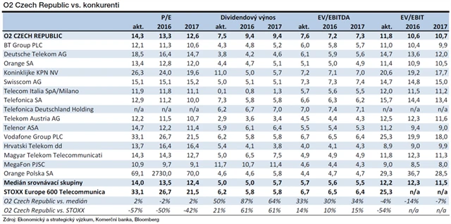 "Podle ukazatele EV/EBITDA by akcie O2 byly ve srovnání s trhem velmi nadhodnocené. Důvodem je ale fakt, že O2 již po vyčlenění veškeré infrastruktury do společnosti CETIN náklady spojené s provozem sítí neodepisuje, ale jsou účtovány formou provozních nákladů na základě fakturace s firmou CETIN. Proto je vhodnější srovnání na základě ukazatele EV/EBIT, z něhož vyplývá, že akcie O2 jsou mírně podhodnocené," vysvětluje analytik.