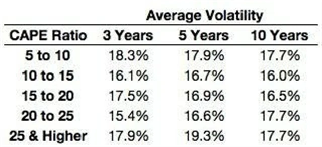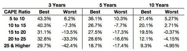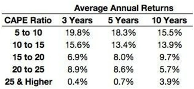 Již slavný hodnotový investor Benjamin Graham říkal, že "podstatou investičního rozhodování je řízení rizik, nikoli výnosů", ale predikce výnosů je vždy mnohem oblíbenějším sportem než řízení rizika, respektive upozorňování na něj. Při predikcích se často používá ukazatel P/E, případně cyklický očištěný CAPE, na kterém investoři prezentují, zda jsou akcie levné, nebo drahé (nyní velice drahé). V tabulce níže je několik výchozích hodnot CAPE a následné průměrné výnosy za 3 roky, pět let a 10 let (od roku 1926).