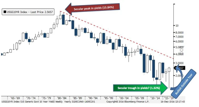 "Bylo by to poprvé od roku 1981, kdy se výnosy 10letých vládních bondů USA vyšplhaly k 16 %, a potvrdilo by to konec sekulárního medvědího trendu dluhopisových výnosů a býčího trendu v případě cen bondů," dodává Krinsky.