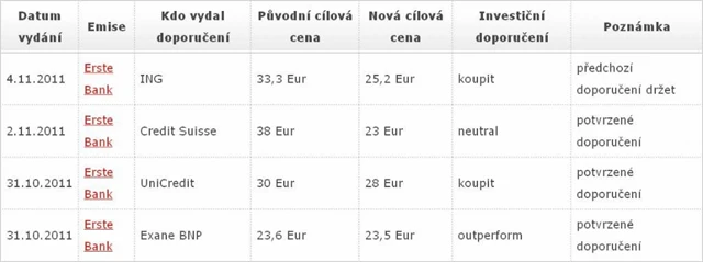Všechny platné cílové ceny leží v tuto chvíli nad hranicí čtyř set korun, po vlně downgradů a snížených valuací má dnes ráno Erste na kontě první zvýšené investiční doporučení. Autorem reportu je ING. I když i analytická dílna této banky seškrtala očekávanou cenu akcií Erste, nový cíl sděluje investorům jediné: v ročním horizontu může být Erste tím nejlepším, co pro své úspory můžete udělat.