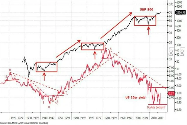 "Současný sekulární býčí trend se nejvíce podobá sekulárnímu trhu z let 1950–1966. 50. léta byla obdobím vyšších úrokových sazeb v USA. Výnosy amerických státních dluhopisů se na konci roku 1945 dostaly na dno kolem 1,5 % a index S&P 500 se v sekulárním býčím trhu udržel až do doby, kdy výnosy vzrostly na 5–6 % v polovině 60. let. Index S&P 500 posílil v tomto období o 460 %," píše Suttmeier.