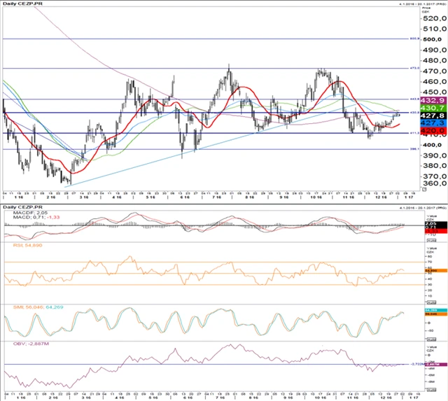 Komerční banka a ČEZ: České blue chips pohledem technické analýzy (4. 1. 2017)