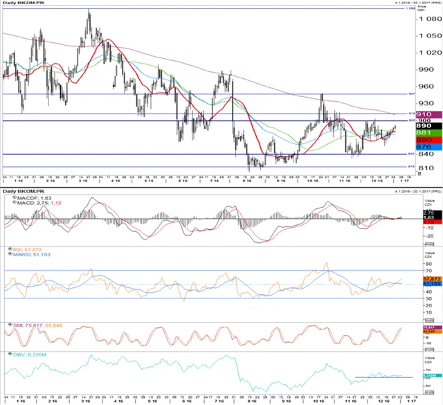 Akcie Komerční banky v uplynulých dnech posilovaly a nacházejí se 10 Kč pod psychologickou hranicí 900 Kč. MACD zastavila propad u nulové hranice a opět zamířila výše, odstup od signální linie je ale velice malý. RSI míří k 60bodové hranici, zatímco SMI pokračuje v růstu v pásmu překoupenosti. Překřížení linií se však zatím nekoná. Indikátor OBV se nachází nad svou podporou, z hlediska dalšího růstu však nenabízí mnoho indicií. Technické indikátory značí pokračování růstového trendu, hranici 900 Kč však akcie banky dlouhodobě nepřekonaly od změny dividendové politiky.