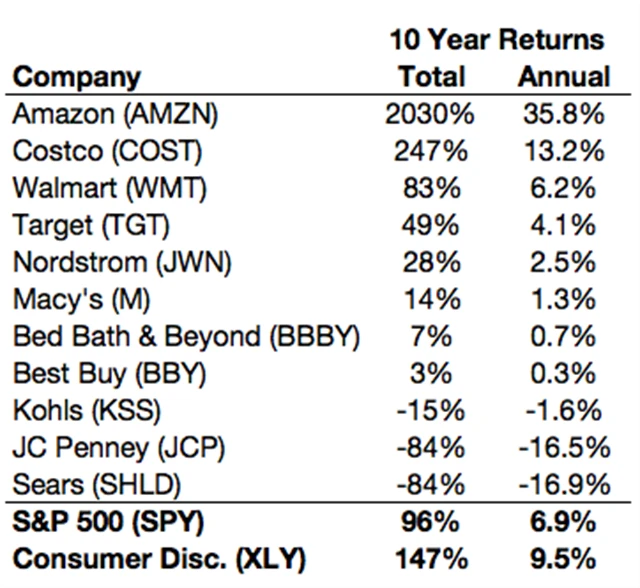 První grafika hovoří sama za sebe. Investoři oceňují Amazon pro jeho vizi, s kterou mění obsah pojmu maloobchod. Jeho současná velikost (tržní kapitalizace) je ohromující, stačí se podívat na srovnání s dalšími americkými maloobchodními řetězci.