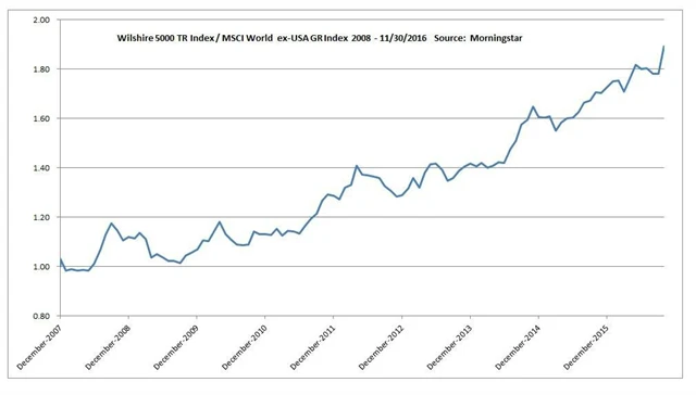 Široký americký index Wilshire 5000 Total Return investorům od roku 2008 vynesl v průměru více než sedm procent ročně, zatímco index světových akcií s vyloučením Spojených států MSCI World ex-USA každý rok v průměru klesl o 0,22 %. Velká část investorů v Americe si tuto nerovnováhu vyložila jasně a zahraničních akcií se jednoduše zbavila. Jonathan Clements, který stojí za portálem HumbleDollar, ale před takovým chováním varuje. A k ruce si bere silné argumenty.