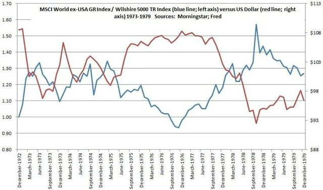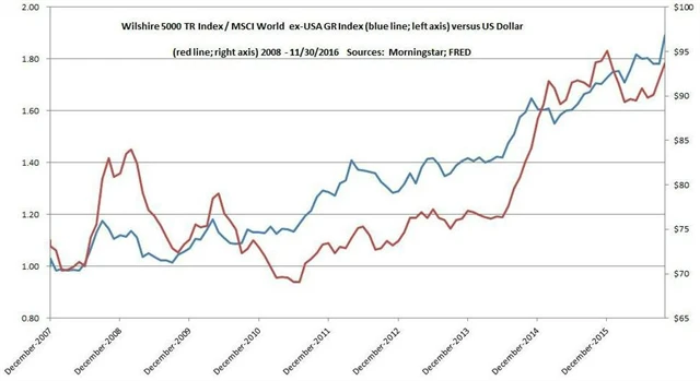 Posilování dolaru tak při podobné výkonnosti amerických akciových indexů a zahraničních akciových benchmarků stlačuje celkové zisky (po měnové konverzi) amerických investorů z držení zahraničních titulů prostřednictvím ADR pod zisky z investování do domácích titulů. Obrácený vztah logicky funguje při oslabování dolaru. To ilustruje graf, který srovnává vývoj dolarového indexu s poměrem výkonnosti benchmarků MSCI World ex-USA a Wilshire 5000 Total Return.
