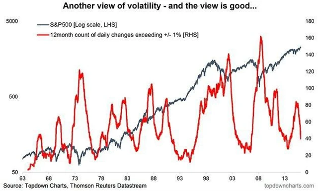 Ukazuje to také na dva typy býčího trendu. Když má růst poněkud divočejší průběh, volatilita stoupá a jsme svědky většího počtu dnů s výraznějším pohybem ceny. Když je býčí trend stabilní, volatilita výrazně klesá. V současnosti zažíváme druhý typ, který může trvat delší dobu.