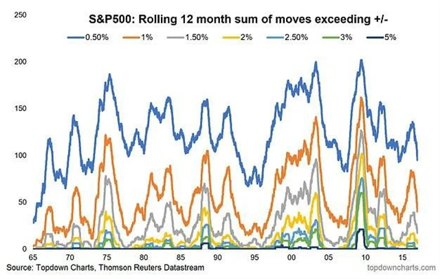 Na obrázku níže není volatilita vyjádřena indexem VIX, ale prostřednictvím změny aktuální ceny indexu S&P 500. Kromě vývoje samotného indexu je na něm zobrazen počet dní v posledních 12 měsících s denním pohybem minimálně o procento nahoru nebo dolů.