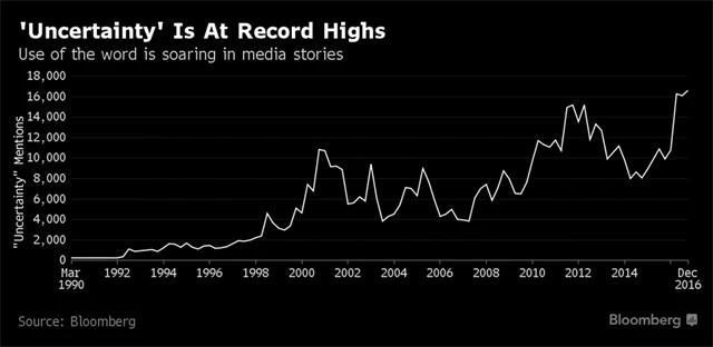 Když je řeč o nejistotě, je potřeba říct, že nejde jen o Donalda Trumpa. Stále častěji se hovoří o francouzských prezidentských volbách, nikam nezmizely otázky vznášející se nad Pekingem nebo Moskvou, Evropa stále nenašla efektivní řešení uprchlické krize, uzavřít se nepodařilo ani krizi kolem extrémního zadlužení Řecka a temné mraky se stále drží nad italskými bankami. A je toho více. Míru nejistoty ve světě dokazuje mimo jiné analýza agentury Bloomberg, jež se zaměřila na frekvenci výskytu slova nejistota ve vybraných zpravodajských zdrojích.