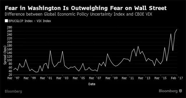 Index volatility VIX (někdy označovaný jako index strachu) se v posledních měsících pohybuje poblíž svého dna. Index nejistoty v oblasti hospodářské politiky (Economic Policy Uncertainty Index) naproti tomu již od poloviny roku 2014 prudce roste. Výsledkem je růst rozdílu mezi těmito dvěma ukazateli na historické maximum.