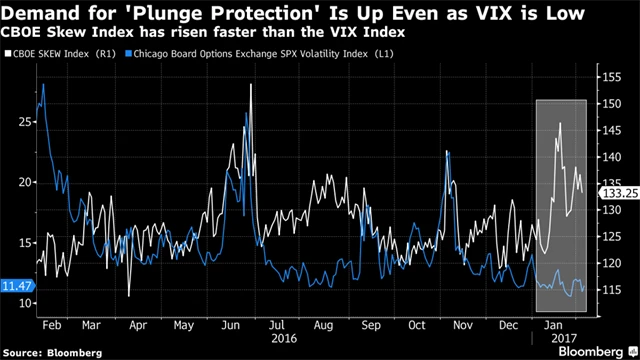 Zajímavé je také srovnání indexu VIX s indexem SKEW, který měří pravděpodobnost nečekaných propadů cen akcií v důsledku událostí typu černých labutí. Čím vyšší index SKEW je, tím větší je podle investorů pravděpodobnost nečekané a hluboké korekce cen akcií. Při srovnání indexu VIX s ukazatelem SKEW je obrázek podobný jako v případě indexu nejistoty v oblasti hospodářské politiky.