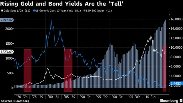 Analytik Chris Flanagan z Bank of America investorům doporučuje, aby v současnosti pozorně sledovali vývoj ceny zlata a vývoj výnosů amerických vládních dluhopisů. "Bude-li růst výnosů amerických vládních dluhopisů pokračovat a současně se bude zvyšovat také cena zlata, měli by investoři zpozornět," říká Flanagan s tím, že by šlo o zdvižený prst varující před růstem volatility a možným krachem cen akcií. Po třech čtvrtletích nepřetržitého růstu dluhopisových výnosů a ceny zlata přišly hluboké korekce cen akcií v letech 1973-1974 a v roce 1987.