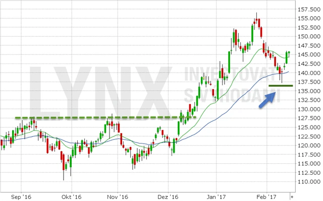 Samotný pullback z posledních dnů lze považovat za nákupní signál. Do trhu plánujeme vstoupit limitem na ceně 143,50 EUR, abychom nebyli příliš daleko od lokálního minima. Cílíme na uzavření gapu ze září 2015 na úrovni 160 EUR. Nebylo by ale překvapením, kdyby cena vzrostla až k 200 EUR. Stop-loss volíme pod minimem nedávné korekce na 136 EUR.