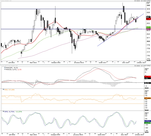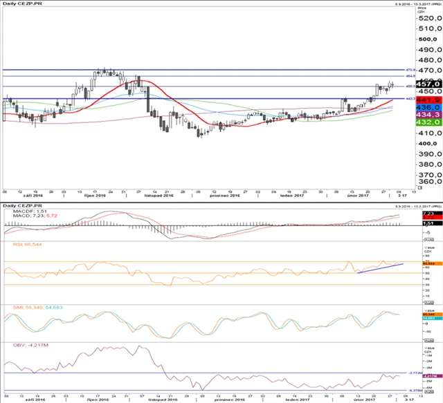 ČEZ zpomalil růst, ale stále proráží rezistence. Jednou z takových je linie 455, ze které titul zahájil svůj prudký propad v listopadu 2016. Současná nejbližší rezistence se nachází na 465. MACD nadále roste, ale odstup od signální linie je neměnný. RSI se zastavil pod pásmem překoupenosti. Vytvoření dalšího vyššího dna u RSI by bylo potvrzením růstového trendu. Pro příští týden naznačují technické indikátory spíše prorůstové tendence. Pokoření rezistence na 465 nám však s ohledem na absolutní výši RSI nepřipadá jako pravděpodobné.
