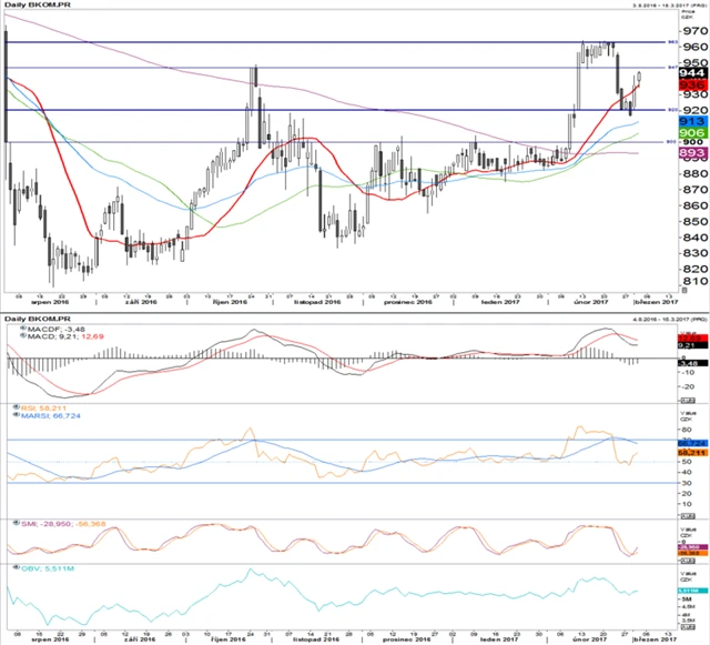 Cena akcií Komerční banky zamířila až k podpoře na 920, od níž se vrací prudce vzhůru. Nejbližší resistence se nachází na 947, silnější pak na 963. MACD zmenšuje svůj odstup od signální linie. RSI zastavil propad těsně pod 50bodovou hranicí a roste. SMI se nachází hluboko v negativním pásmu, překřížení linií je býčím signálem. Rezistenci na 947 nelze brát příliš vážně, v nedávné době se neosvědčila. Cena se poměrně úspěšně zotavuje, indikátory signalizují další růst. Očekáváme, že dojde k proražení nad 947.