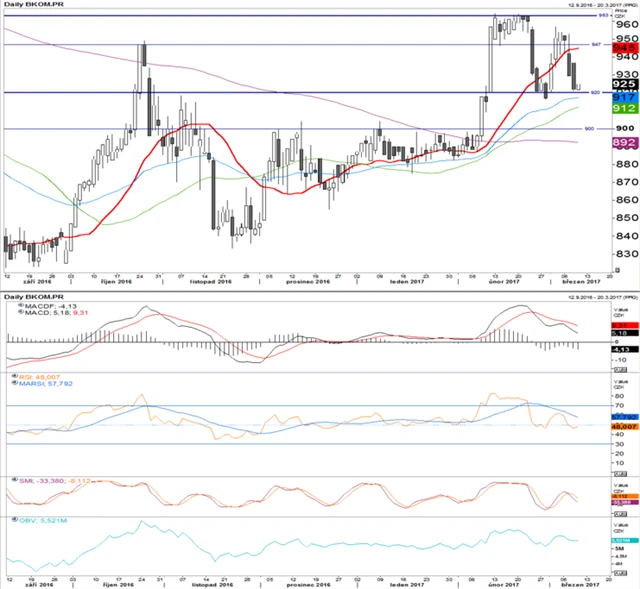 K proražení nad 947 došlo, ale stejně jako v případě ČEZ se jednalo pouze o krátkodobou záležitost. Následný propad se opět zastavil na podpoře 920. MACD pokračuje v propadu, stále se však drží v kladném pásmu. RSI již zavítal pod 50bodovou hranici, záhy se však stabilizoval a nyní míří opět vzhůru. Podpora na 920 se osvědčila již jednou a čekáme, že vydrží i tentokrát. Proražení RSI nad 50bodovou hranici by bylo růstovým signálem. Pro příští týden očekáváme prorůstové tendence.