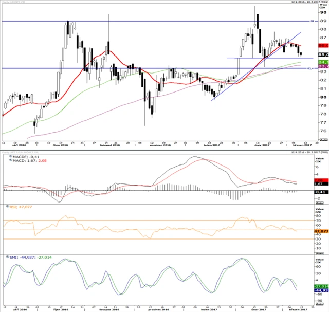 Dvouměsíční podpůrná linie nevydržela. Cena akcií se pozvolnými kroky propadá k podpoře na 84,65. MACD má mírně sestupnou tendenci, ale odstup od signální linie se zmenšuje. RSI poklesl pod 50bodovou hranici. SMI je nyní již téměř na úrovni šestiměsíčních minim. Při pohledu na blízkost podpory, vývoj MACD a absolutní úroveň SMI očekáváme, že cena akcií nalezne v příštích dnech své dno.