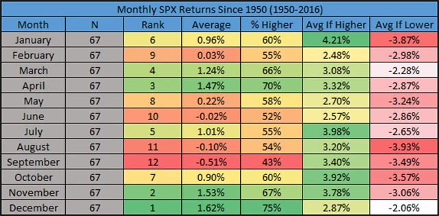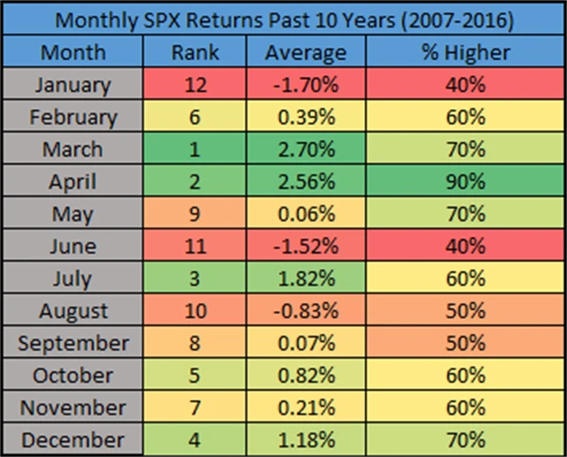 Nejprve si ukažme, jak na tom je březen v rámci roku, pokud jde o výkonnost akcií. V posledních deseti letech slušně. Index S&P 500 v letech 2007 až 2016 v průměru zhodnotil o 2,7 %, což z března udělalo nejsilnější měsíc v roce, ačkoli duben vykázal ještě větší spolehlivost, pokud jde o kladné zhodnocení (9 z 10). Podle stejného srovnání byl leden naopak nejhorším měsícem (-1,7 %, 6 z 10 let v záporu), jemuž se blíží již pouze červen.