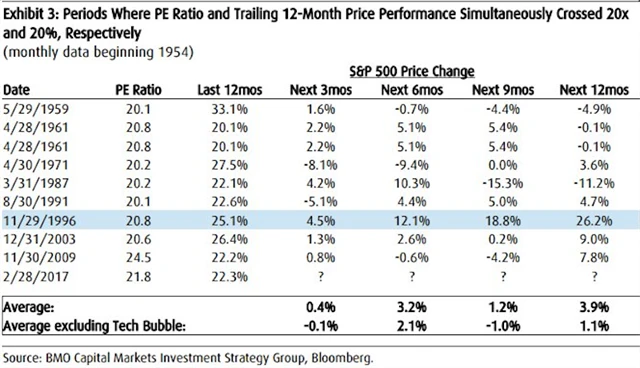 Naposledy ale upozornil na něco jiného – ukazatel P/E (poměr ceny akcie a zisku na akcii) překročil úroveň 20 a zároveň index S&P 500 za uplynulých 12 měsíců posílil o více než 20 %. To se podle Belskiho od roku 1954 stalo teprve podesáté. Hned tedy máme na světě krásný nereprezentativní vzorek devíti případů a pravidlo "20/20".