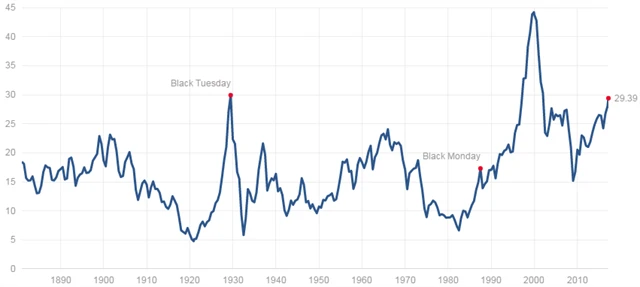 No a nakonec se vraťme na začátek. Moderní otec povídání o tržních bublinách Robert Shiller považuje americké akcie v současnosti za vysoce předražené. Jeho vlastní indikátor, takzvané Shillerovo P/E (CAPE – P/E vztahující cenu k ziskům firem za posledních 10 let), to ostatně křičí do světa už hezkých pár měsíců. "Investoři se příliš soustředí na možná pozitiva a zapomínají na hrozby spojené například s novou Trumpovou agendou," uvedl Shiller pro Bloomberg.