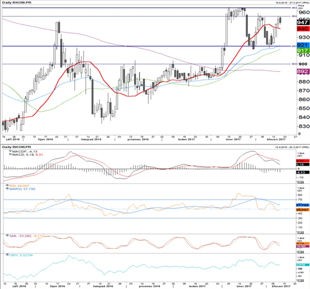 Podpora na 920 zafungovala a akcie KB se podle očekávání přiblížily k rezistenci na 954. MACD míří zdola k proražení signální linie, což by samo o sobě byl růstový signál. RSI je stabilní kolem 57 bodů a SMI nevysílá výrazný signál. Zajímavý je pohled na objemový indikátor OBV, který má schopnost předcházet vývoj ceny. Indikátor již prorazil rezistenci, na rozdíl od ceny akcií. Proto i při pohledu na vývoj MACD očekáváme nárůst ceny nad 950.