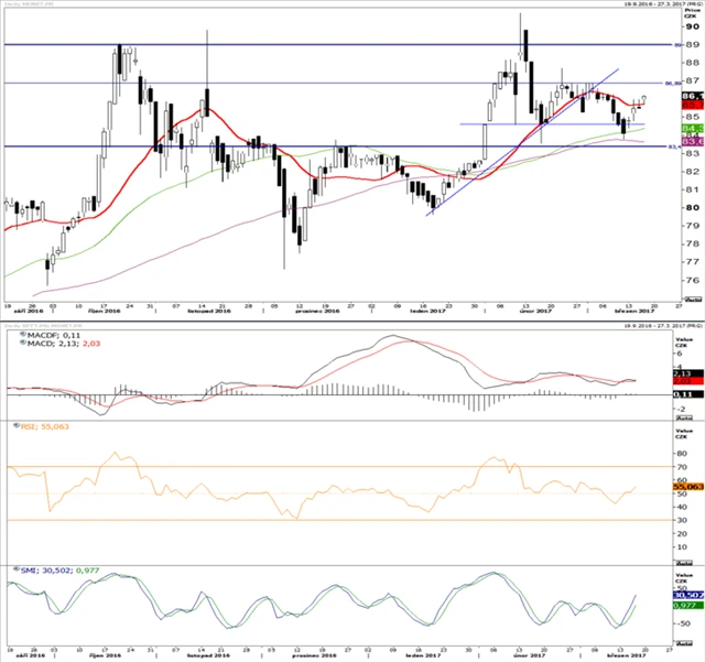 Akcie Monety nalezly dno na 84. Od této hranice cena nenápadně roste. MACD zastavila růst nad signální linii a pohybuje se víceméně do strany. RSI se v uplynulých dnech dostal nad 50 bodů a pokračuje v mírném růstu. SMI se dostal z minim, do maxim má ale stále daleko. Z indikátorů tedy nelze mnoho vyčíst, a musíme proto spoléhat spíše na celkový trend. Nejbližší rezistence se nachází na 87 a očekáváme, že se cena bude této úrovni přibližovat. Blížící se výplata dividendy by tento vývoj měla podpořit.