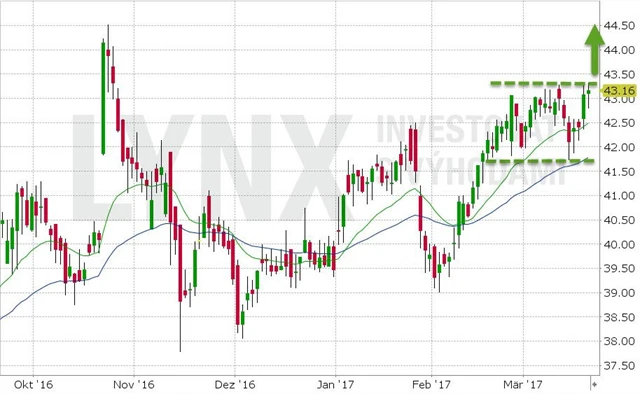 Jako vhodný vstup do nákupní pozice volíme proražení nad 43,40 USD. Spekulujeme na pokračování trendu a vytvoření nového maxima na 46 USD. Pozor je potřeba dát na chování ceny u rezistence 44,52 USD, kde je možné případně zavřít polovinu pozice. Vzhledem k tomu, že je titul méně volatilní, je možné navýšit obchodovaný objem.