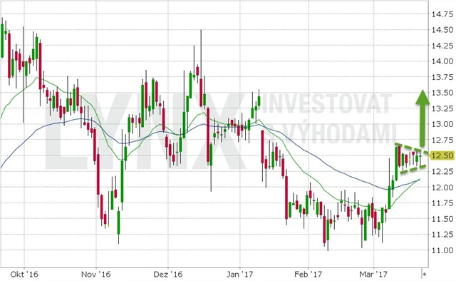 Na konci roku 2016 se trh pokusil nabrat sílu, pozitivní náladu ale neudržel. Nyní se cena opět dostala nad oba klouzavé průměry a z technického pohledu na graf lze vyčíst formaci býčí vlajky. Ta při proražení výše může zažehnout nové nákupní momentum.
