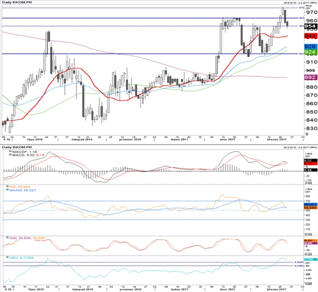 Cena akcií vystoupala až k 976, tedy nad rezistenci na 963. Záhy však titul prudce oslabil až k 953, kde se již v předchozích týdnech vytvořila významná hladina se střední silou. MACD je po korekci v podstatě stabilní, ačkoliv odstup od signální linie se logicky zmenšil. RSI zpomaluje svůj propad, nicméně stále má namířeno k 50bodové hranici, která by mohla sloužit jako podpora. Nejzajímavější signál nabízí objemový indikátor OBV. Ten se stále drží vysoko nad svou rezistencí. Podle něj by tedy nemělo dojít k výraznému propadu pod 953. A to je i naše teze pro příští týden.