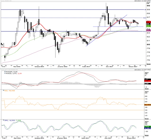 Pozvolnými kroky nahoru, následně pozvolnými kroky dolů. Cena akcií Monety Money Bank přešlapuje mezi 84 a 86. Současná cena je na úrovni 20denního průměru. RSI je v současnosti na úrovni 50bodové hranice. MACD pozvolna zvyšuje odstup od signální linie. SMI neposkytuje výraznější signál, rychlá linie je pod úrovní té pomalé a klesá, to vše se ale odehrává poblíž nulové hranice. Zásadní změnu pro příští týden neočekáváme. Nejbližší podporu vidíme na úrovni 84,50.